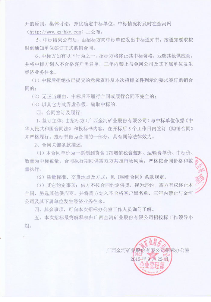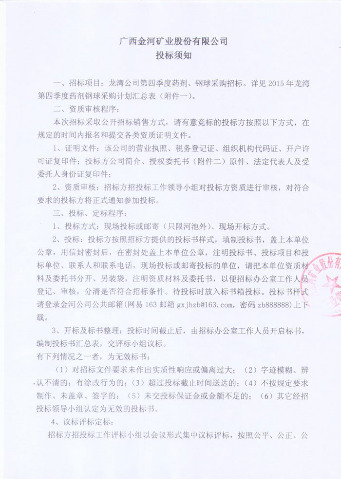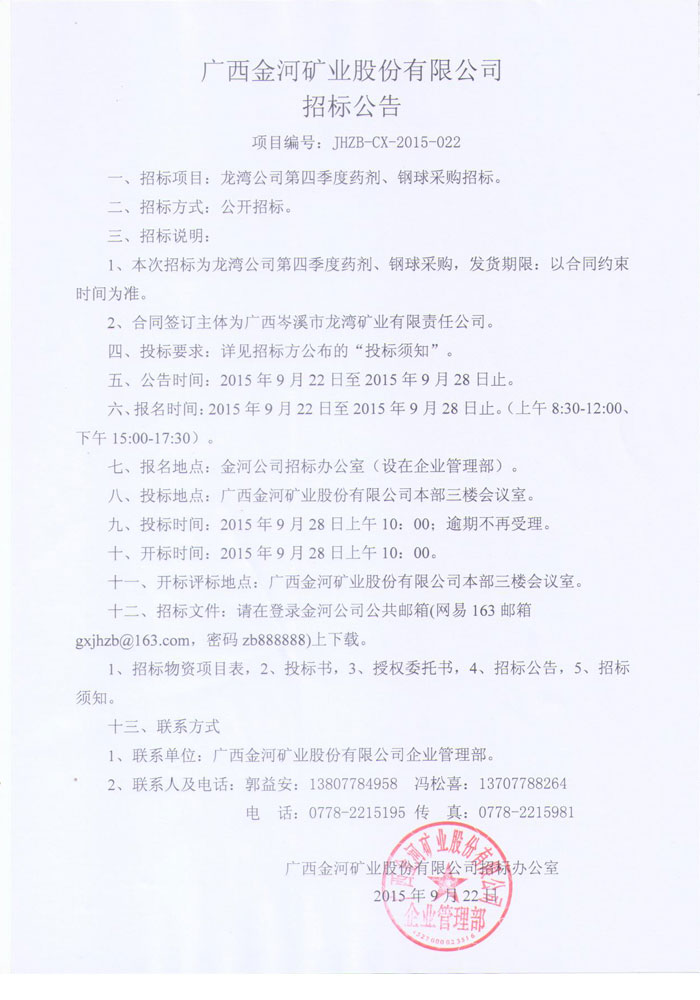 廣西金河礦業股份有限公司2015年龍灣第四季度采購招標公告