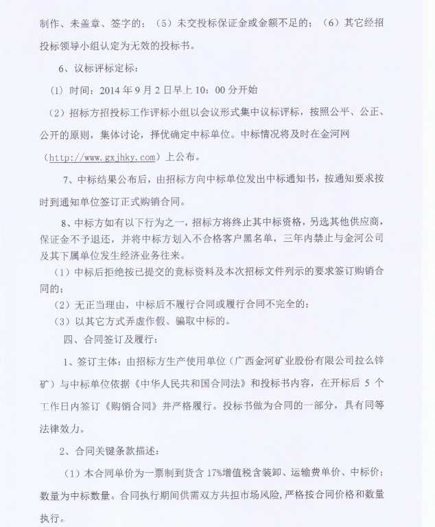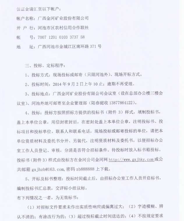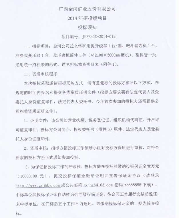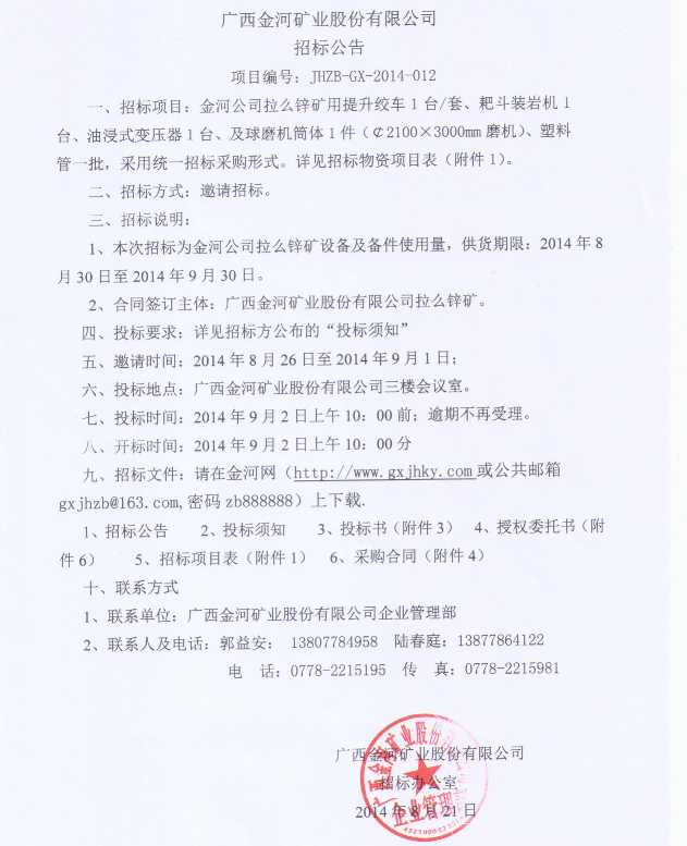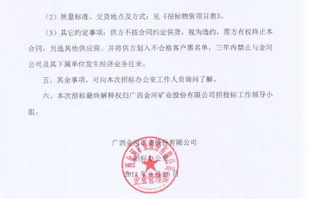 關于2014年金河公司第三季度臨時物資采購招標公告