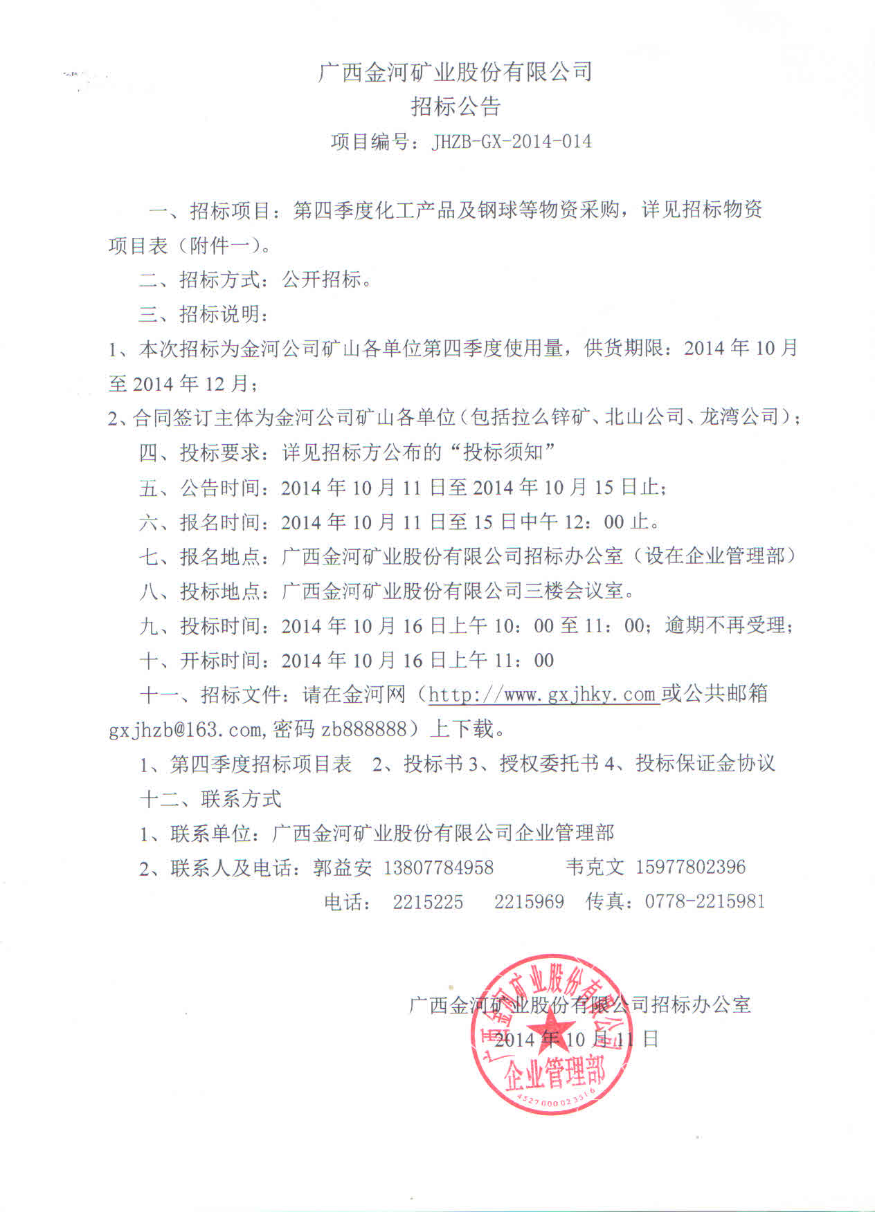 金河公司第四季度化工產品及鋼球等物質采購招標公告