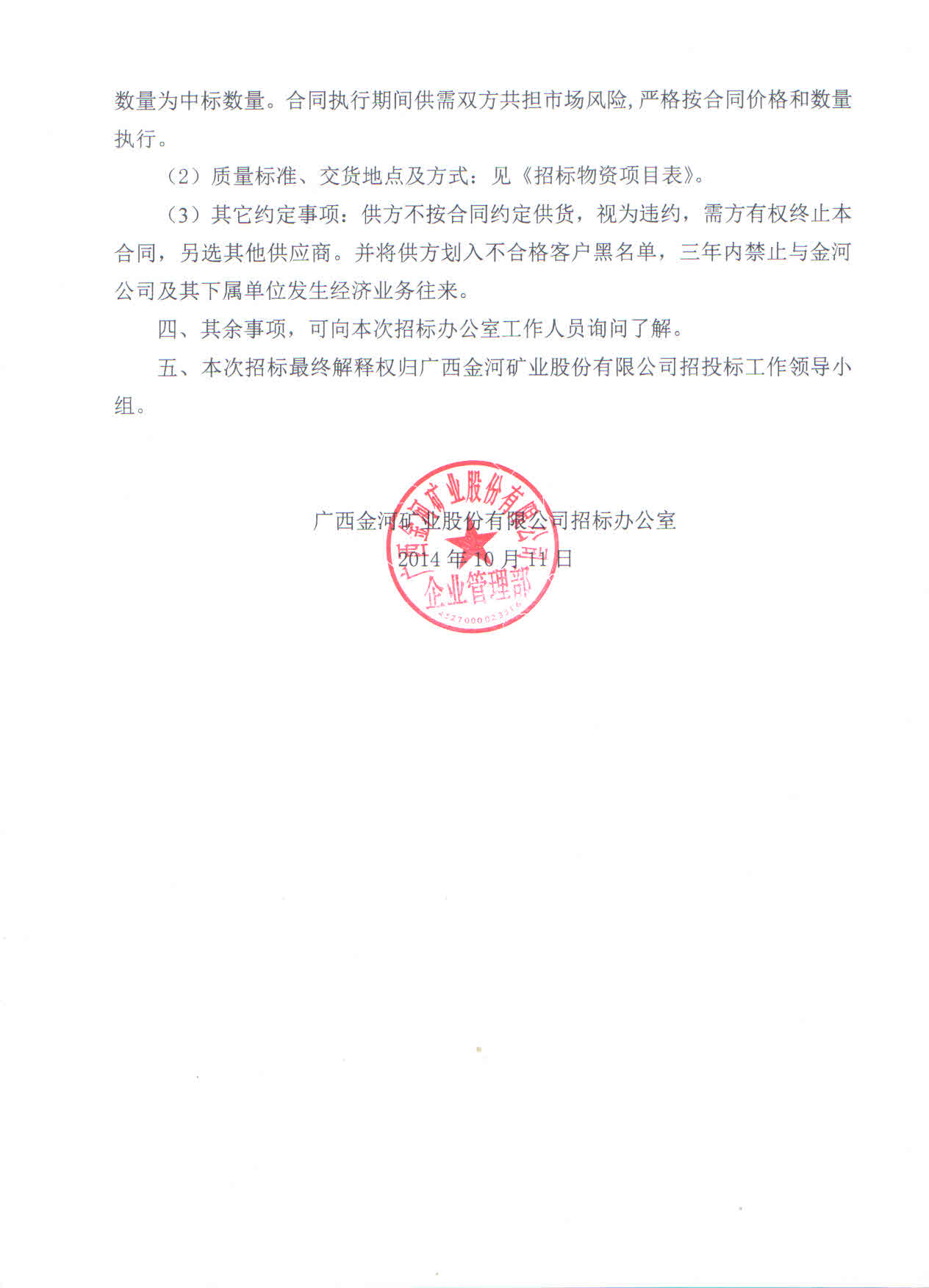 關于2014年金河公司第三季度臨時物資采購招標公告