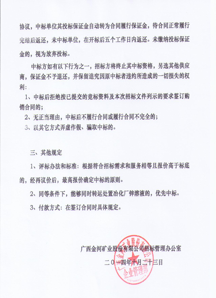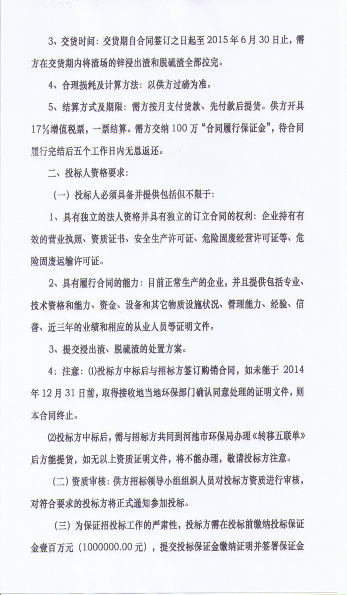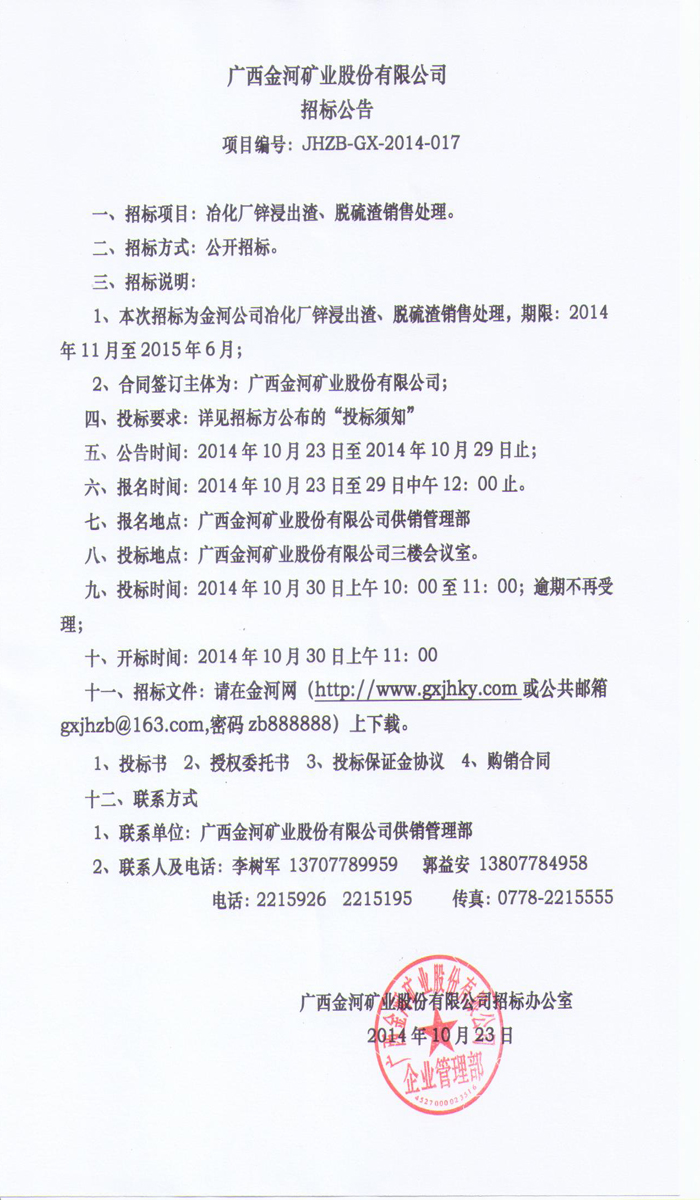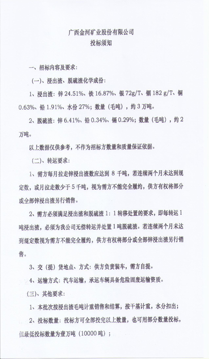 廣西金河礦業股份有限公司三萬噸鋅浸出渣及脫硫渣銷售招標公告