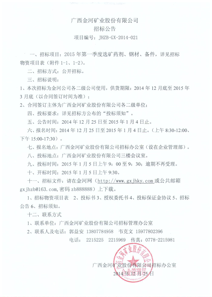 廣西金河礦業股份有限公司2015年第一季度招標公告 |