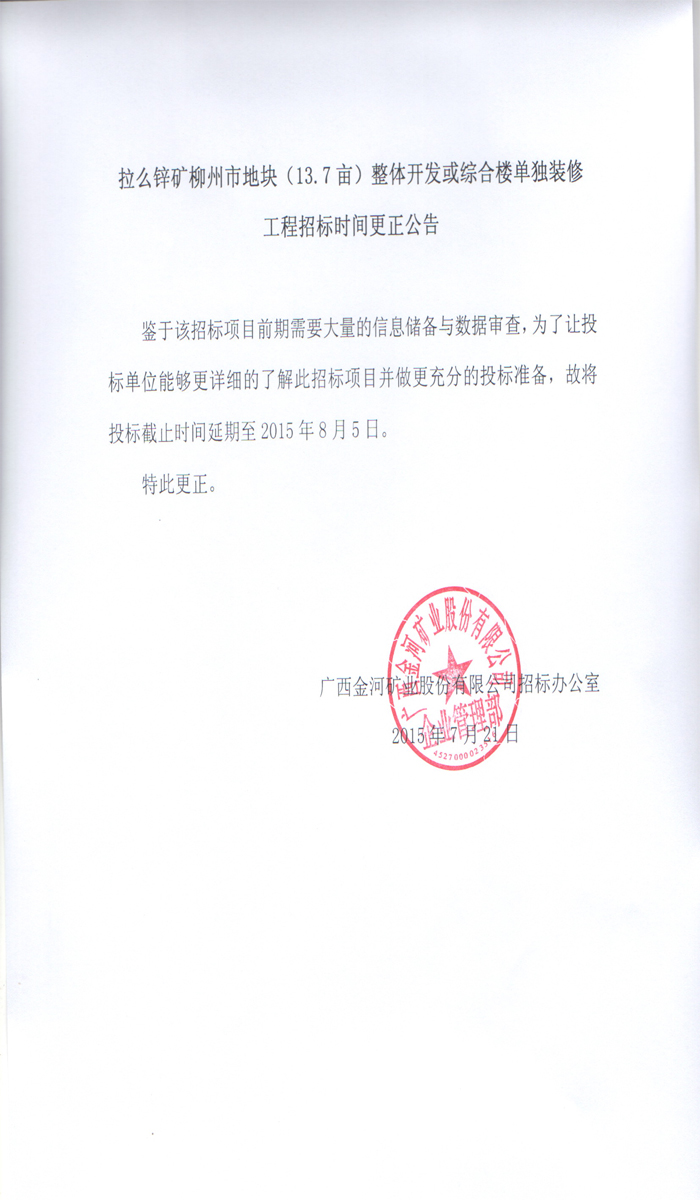 廣西金河礦業股份有限公司拉么鋅礦柳州市地塊(13.7畝)整體開發或綜合樓單獨裝修工程招標時間更正公告 |