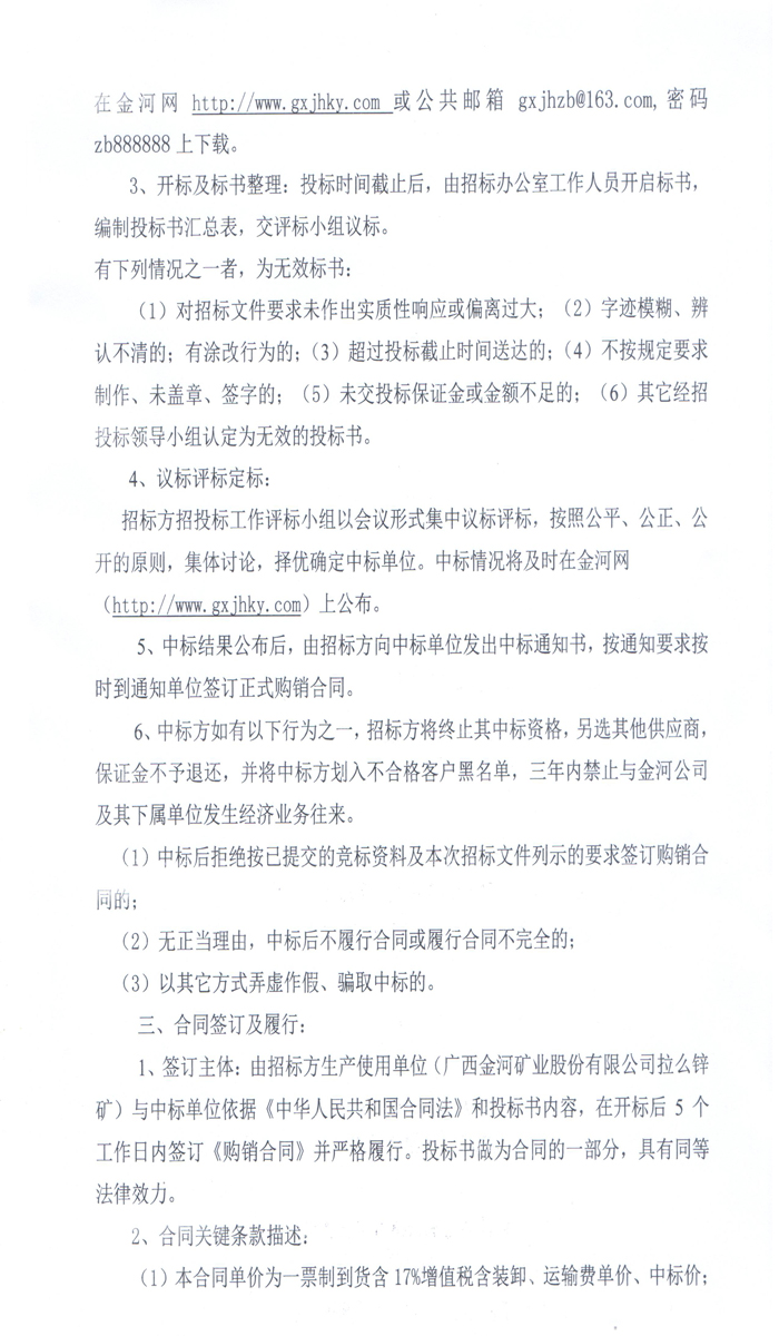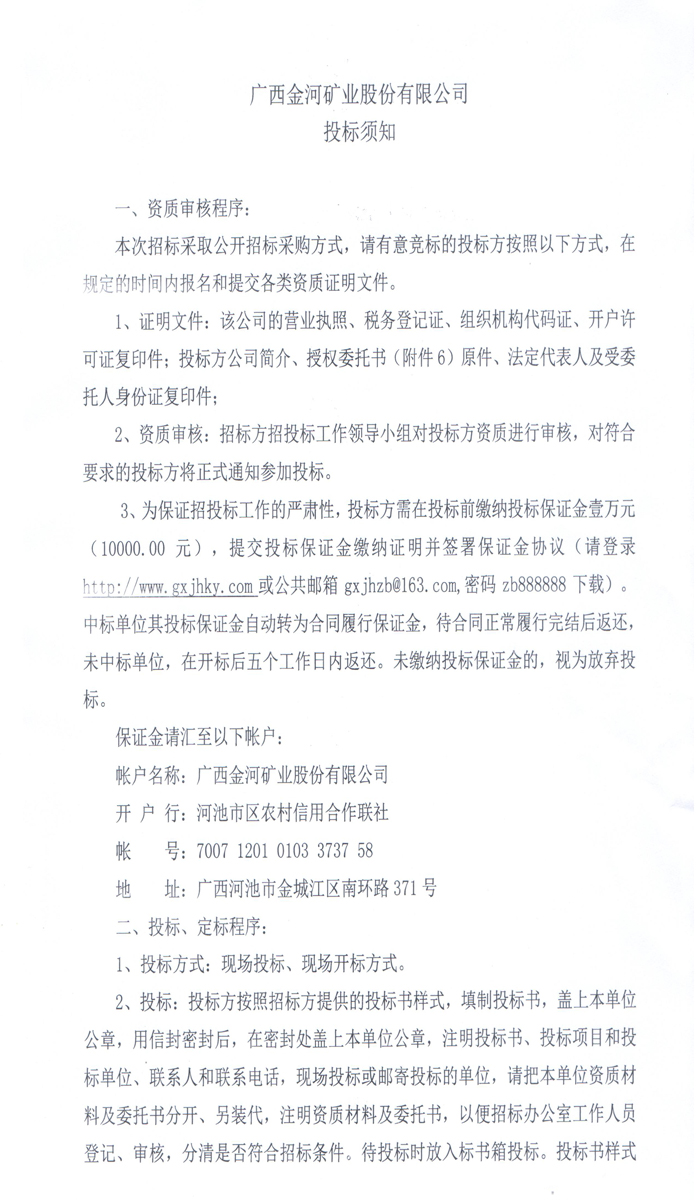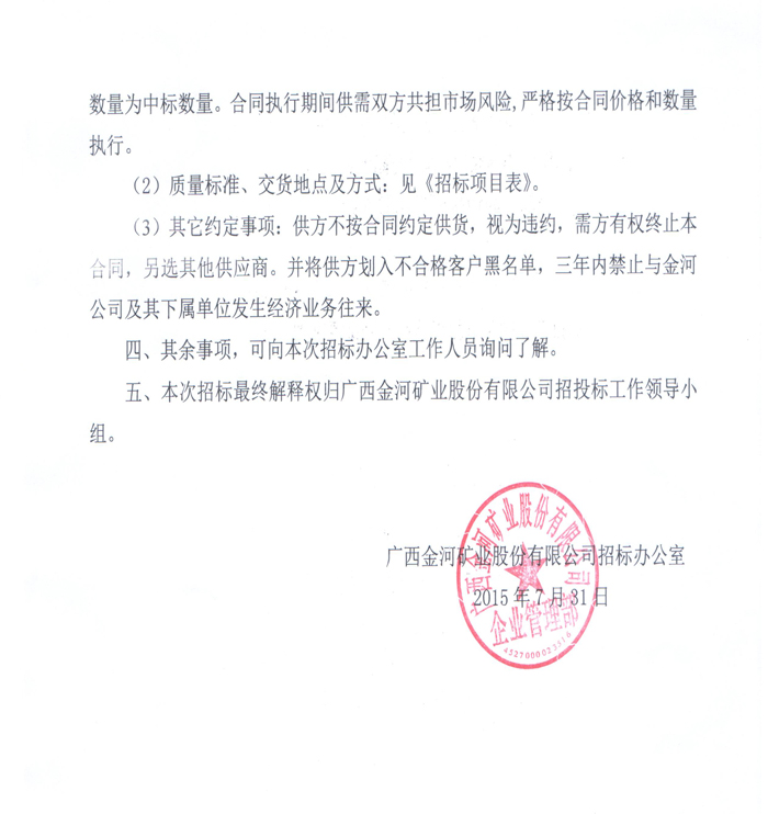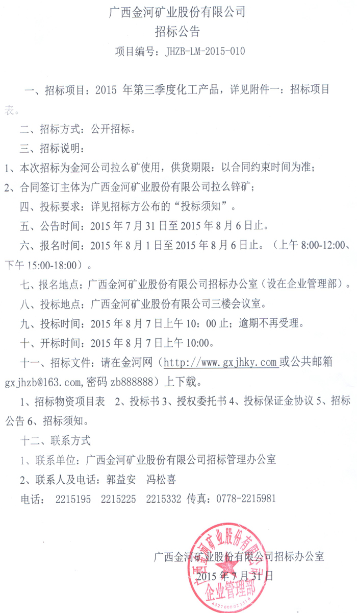 廣西金河礦業股份有限公司2015年第三季度化工產品招標公告