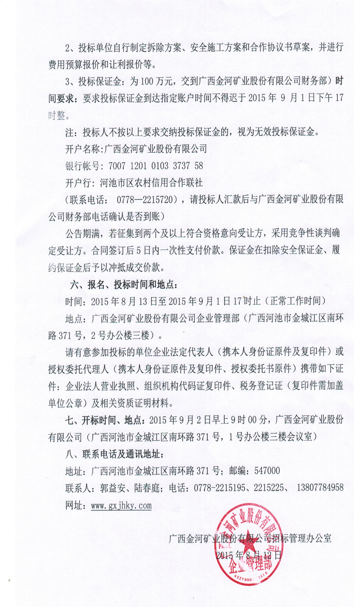 廣西金河礦業(yè)股份有限公司關(guān)于冶化廠固定資產(chǎn)處置招標(biāo)公告